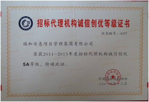 2011-2013年度招标代理机构诚信创优5A等级证书