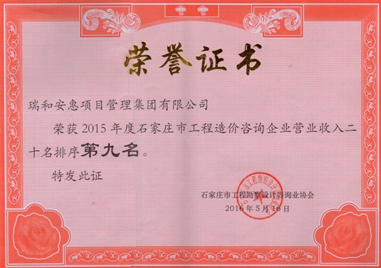 接到通知后,我公司积极响应,仔细研究文件要求,认真完成资料的整理、组卷及申报。经协会及专业的会计师事务所对各企业的申报资料进行审核,最终我公司荣获“2015年度石家庄市工程造价咨询企业营业收入二十名排序 第九名”的好成绩。